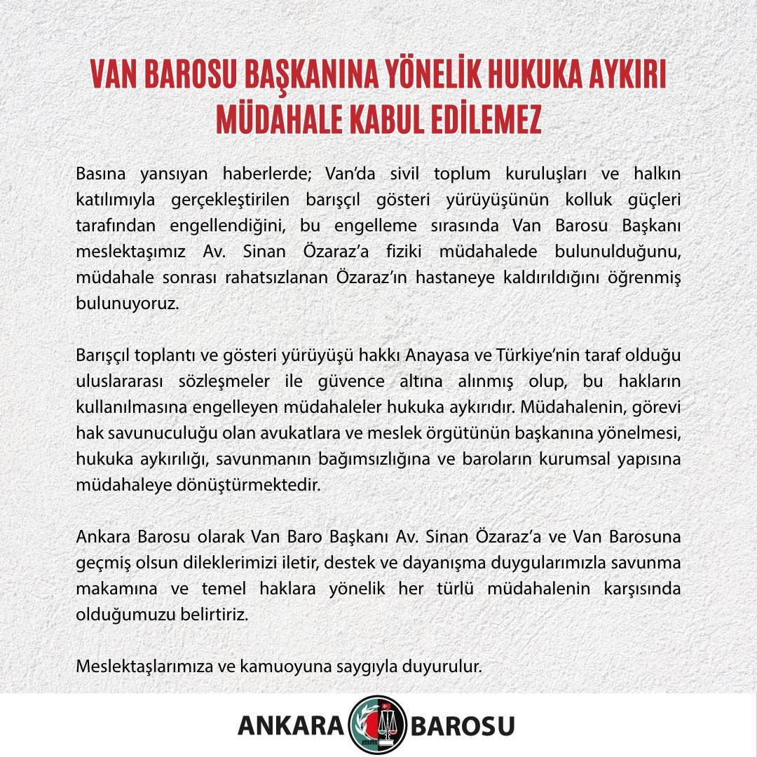 Basına yansıyan haberlerde; Van’da sivil toplum kuruluşları ve halkın katılımıyla gerçekleştirilen barışçıl gösteri yürüyüşünün kolluk güçleri tarafından engellendiğini, bu engelleme sırasında Van Barosu Başkanı meslektaşımız Av. Sinan Özaraz’a fiziki müdahalede bulunulduğunu, müdahale sonrası rahatsızlanan Özaraz’ın hastaneye kaldırıldığını öğrenmiş bulunuyoruz.